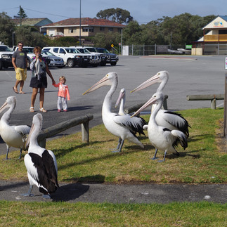 Ce matin à Albany, c'était les retrouvailles avec les pélicans de Emu Point qui nous avaient tellement épatés par leur taille il y a quelques années. On nous avait dit qu'ils vivaient là-bas, sur la jetée d'Emu Point à Albany, guettant toute la journée le retour des pêcheurs amateurs. On s'est dit que si les habitudes n'avaient pas trop changé, on devrait encore les y trouver! Départ tôt le matin pour un petit déjeuner sur place (l'avantage de la maison roulante!)... ils sont là! dans l'eau, sur les poteaux, une dizaine d'individus attendent patiemment un événement. Bon, moins romantique que le retour de pêche, nous avons malgré tout la chance d'assister au passage de l'éboueur qui vient vider les poubelles de carcasses de poiscaille!!! Ils sortent alors tous de l'eau, dans leur marche dandinante, pour venir réclamer un petit reste de quelque chose; la bataille est rude, seuls 2 ou 3 parviendront à attraper un petit (ou gros!!) festin. Leur poche est impressionnante d'élasticité! Un bon moment encore passé grâce à la faune locale! Il y a 5 ans, Basile faisait la taille de ces belles bêtes, on voit cette année qu'il a bien grandi! Mais Zoé ne pèse pas lourd et n'ose pas s'approcher!