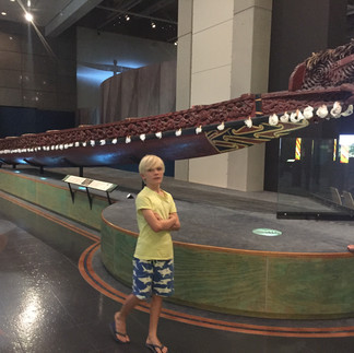 6 et 7 décembre : nous voilà arrivés à Wellington, la ville la plus au sud de l’île du Nord : c’est un port de belle taille, une ville au cœur actif et grouillant, quelques immeubles, et de jolies maisons construites sur les collines tout autour. Wellington nous intéresse car ce sera notre point de départ en ferry pour rejoindre l’île du Sud, et parce qu’elle possède le musée national sur la Nouvelle-Zélande, « Te Papa », dont on a entendu que du bien, notamment pour les enfants. On a trouvé un parking en plein centre à 15 minutes à pieds du musée sur lequel on a le droit de poser le camping-car pour 24h : pas glamour mais bien pratique !! On arrive donc au musée vers 16h30 : la section « terre et mer » est très chouette, interactive, sur la faune, la flore et les phénomènes sismiques du pays. On y trouve entre autres la reproduction d’un cœur de baleine bleue dans lequel les enfants peuvent rentrer !, un calamar géant formolé, pêché dans le coin il y a quelques années avec les vidéos de la pêche, puis de l’analyse scientifique du bétail, des vidéos et toutes sortes de coupes 3D interactives sur l’activité des plaques tectoniques (avec notre expérience de Lifou, ça prend bien du sens !), la maison du tremblement de terre qui vibre en entier réellement, des jeux sur l’échelle de Richter, toute une section sur l’écologie avec des jeux vidéos éducatifs, l’essentiel de la faune néozélandaise empaillée en vitrine (différentes sortes de kiwi notamment), des jolies maquettes sur les espèces disparues ayant peuplées le pays (le Mao, le plus gros oiseau du monde avant l’autruche, mais il n’existe plus), ou le tuatara qui existe toujours et qui est une espèce de lézard descendant directement du dinosaure… L’étage concernant l’histoire et la culture du pays, essentiellement maorie, est superbe également : vidéos et chants de haka, « marae » traditionnelles et actuelles sculptées (habitat maori) en taille réelle, pirogues, bijoux, armes, vêtements (le piu-piu = la jupe végétale !), les tatouages… Nous y restons jusqu’à la fermeture et je lis le soir même aux enfants l’histoire complète de la Nouvelle-Zélande, ce qui permet de faire un lien plein de sens avec ce qui vient d’être vu dans le musée (Basile passionné, Félix laconique : « j’ai rien compris »… !!!)