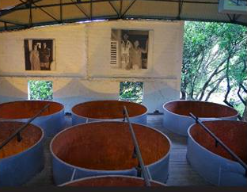 Pour notre réveil le lendemain, c'est pluie! La Martinique connaissait une sécheresse particulièrement remarquable depuis plusieurs semaines cette année, et bien l'eau qui arrive, c'est cadeau, c'est pour nous! Alors, bon, si ça fait plaisir aux locaux, forcément ça nous fait plaisir aussi (brin d'ironie)! On prend nos marques tranquillou (avec le décalage horaire, le réveil est précoce, 5h!), petit déjeuner-papote bien agréable sur la terrasse (oui parce qu'il pleut, mais il fait bon quand même!), courses, déjeuner, et on se décide, sur cette journée de météo très humide, à prendre la route pour aller visiter l'habitation Clément, sa rhumerie, et son centre d'art contemporain. Son jardin splendide expose des oeuvres d'art disséminées partout qui se marient parfaitement avec la végétation particulièrement élégante du lieu; visite avec audioguide (les enfants ont, à leur propre demande, patiemment écouté chaque explication de chaque oeuvre d'art... ils nous épatent parfois!), le parcours est très réussi. Et en plus le soleil a refait une apparition! Puis on arrive sur l'ancienne distillerie, qui a fait la réputation mondiale du rhum AOC Clément, et ses cinq chais de vieillissement où mûrissent toujours rhums vieux et cuvées spéciales: les vapeurs d'alcool y dégagent un parfum entêtant! La maison d'habitation du XVIIIe siècle a été magnifiquement restaurée et remeublée, on est plongé dans l'histoire de l'exploitation de la canne à sucre, et donc dans cette ambiance si propre à l'histoire des Antilles! Les enfants avaient pu regarder avec nous avant de partir deux films historiques sur la Martinique, "Biguine" et "la Rue Case-Nègres", c'est donc avec beaucoup d'intérêt qu'ils ont déambulé dans ces lieux charmants.