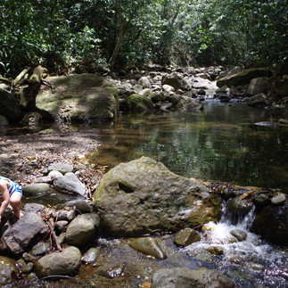 Cinquième journée : que c’est riche ! On se réveille encore tôt (six heures), que c’est facile d’ouvrir les yeux sous les Tropiques ! Ce matin, le ciel est bleu, la lumière est déjà magnifique, les colibris viennent butiner dans les fleurs devant notre terrasse pendant le petit déjeuner, mais ils sont trop furtifs pour que j’aie le temps de les capturer en image, alors je garde un peu égoïstement leur ballet en tête rien que pour moi ! Il faut faire le ménage de la location (pendant que les enfants profitent une dernière fois de la super piscine), et nous voilà en route en milieu de matinée pour aller se promener dans l’Habitation Céron, un lieu assez magique. Une habitation est donc le terme employé ici pour désigner les anciennes exploitations agricoles (avec des esclaves initialement bien sûr, qui deviendront plus tard des employés…), gérées par les Becké (les Blancs venus s’installer), pour la production de sucre, de rhum, de cacao… On a de la chance, en ce dimanche matin, c’est une journée de promotion des habitations du Nord de l’île, l’entrée est donc exceptionnellement gratuite ! Chouette ! Des habitations, il y en a plein sur l’île, mais certaines sont particulièrement mises en valeur. Pas de demeure à visiter ici, la maison coloniale est toujours une propriété privée, mais le site montre des ruines restantes dans une végétation somptueuse, les arbres sont ici gigantesques ! Ce lieu abrite notamment le zamana le plus gros de l’île ! Agé de 300 ans, ses branchages couvrent un hectare de surface !! Majestueux ! On ne se lasse pas de déambuler dans ses lieux chargés d’histoire, au cœur d’une nature grouillante.. Les enfants profitent de la rivière qui serpente sur la propriété, on prend le temps, on cherche attentivement la star des lieux : la matoutou falaise… La quoi ?? La matoutou falaise !! une espèce de mygale endémique des Antilles, aux reflets irisés de bleu, de vert ou de rouge.. Particulièrement présente dans le Nord de l’île : introuvable… on se console avec la dégustation d’un sandwich fabriqué dans le resto plein de charme de l’endroit (rillettes de poisson et coriandre !), et d’un petit coup à boire pour aller avec bien sûr… Mais au moment de quitter les lieux, on reste sur notre frustration de la matoutou, alors on demande aux employés où les trouver. On nous répond qu’elles sont difficiles à voir en ce moment car il fait trop chaud, mais heureusement, une dame nous écoute et nous dit qu’elle en a vues plusieurs ! Elle nous explique où les chercher (aux mêmes endroits que nous avions inspectés pourtant), on comprend comment repérer les cocons, et oh miracle, on en trouve ! Six au total sur 3 arbres différents, mais elles se fondent magnifiquement dans le paysage ! Malignes les filles ! Belle émotion, c’est la première fois qu’on observe des mygales en milieu naturel ! Et celles là sont particulièrement joliment colorées, même si deux ou trois se recroquevillent illico dans le cocon ou dans une anfractuosité des troncs, j’ai réussi à tirer le portrait de trois d’entre elles ! L’honneur est sauf !