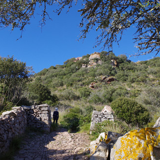 La première nous a été conseillée par Stéphanie, notre hôte de l'hôtel Ses Sucreres, et sans ses conseils, nous n'aurions pas du tout eu l'idée d'y aller, rien n'est indiqué! Il s'agit d'une petite balade le long d'une ancienne voie romaine, chemin de pierres qui mène aux ruines de Santa Agueda, perchées sur une colline, d'où l'on jouit d'une vue géniale à 360 degrés sur la mer et la campagne environnante. Le chateau, érigé entre le X et le XIIIe siècle à l'époque où les Baléares étaient musulmanes, servit de refuge à la population lorsque Minorque fut envahie par les Catalans au XIIIe siècle, avant de capituler.
