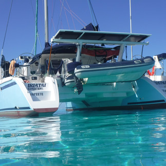 « Iriatai » (horizon ou grand large en polynésien), un catamaran Nautitech de 43,5 pieds, et ses propriétaires, Marie et Arthur, nous attendent pour le rêve de Pierre, une croisière de 6 jours dans les Iles sous le Vent. Nos hôtes sont tout jeunes, à peine 30 ans, et le courant passe immédiatement, avec nous comme avec les enfants, qui sont super heureux d’avoir à leur côté une génération intermédiaire.