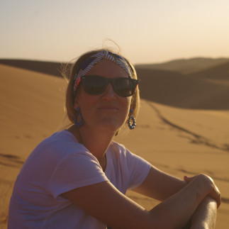 A mi-chemin, nous nous arrêtons à « l’Oasis Sacrée », une vraie oasis au milieu du désert, c’est-à-dire une source naturelle émergeant du sable, précieusement surveillée par un gardien. Puis au bout de deux heures de piste sportive et chaotique (Omar en est à son 4e trajet de la journée !! il pourrait faire la piste les yeux fermés, pourtant souvent je me suis dit qu’elle n’était pas tracée de façon évidente !), nous voilà arrivés au pied des dunes de l’Erg Chigaga, au bivouac d’Omar : peu de mots pour décrire cette sensation incroyable lorsqu’on se retrouve sur un sommet à contempler l’immensité de cette mer de sable lisse et ronde… L’impression d’être aux portes d’un autre monde… Impossible de se lasser des vues, des reliefs, des couleurs. Les enfants s’éclatent à sauter, dévaler en courant, faire des roulé-boulé, et même de la luge !! Je capture inlassablement tous ces moments dans la boite, en contemplant progressivement le soleil descendre : on est bien, quoi ! Par moment le vent se lève et le sable fouette le visage, il s’insinue partout, on aurait bien envie d'avoir nous aussi nos chèches en protection ! Zoé ne résiste pas à la pause égyptienne: le retour!! La suite de la soirée se poursuit au bivouac avec un thé (très amer !!), puis plus tard un repas sous la tente berbère : tajine délicieusement parfumé, ils sont très forts dans le maniement des épices, ces Marocains ! Le ciel étoilé est merveilleux évidemment… Et il ne fait même pas très froid, les températures sont juste douces avec un petit pull… 22h : Il est temps de rentrer, nous reprenons le 4X4 pour les deux heures de retour, expérience inédite de cette piste de sable dans la nuit noire, à la lumière des phares. On retourne dans notre camping-car, en s’imaginant rêver de mers de sable toute la nuit ! Aucun regret au final, cette après-midi a tenu ses promesses, le désert nous a littéralement envoûtés !