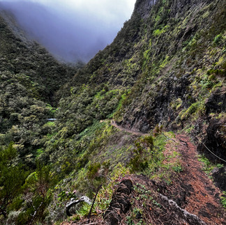 Le temps tourne alors que nous venons de repasser la passerelle de la mort, le tonnerre gronde et résonne dans les failles de Mafate, puis la pluie arrive : on sort les vestes, et il faut désormais composer avec l’humidité et redoubler de prudence sur la dernière heure de marche.