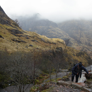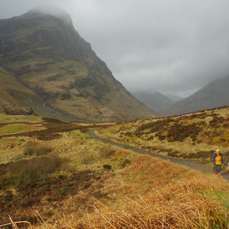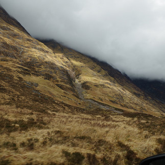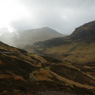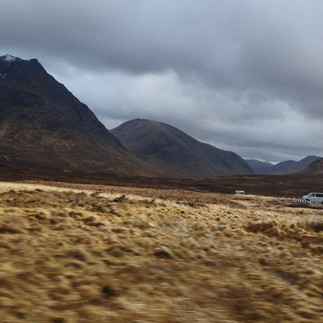 Nous sommes installés pour deux jours et trois nuits à l'auberge de jeunesse de Glencoe, sur un chemin forestier, au coeur des somptueux massifs du Lochaber, cette immense région du Sud-Ouest des Highlands. Le joli ciel bleu du premier jour a vite laissé la place à une météo très écossaise (les fameuses douches!) où il n'est pas question d'apparition du soleil, mais du degré d'intensité de la pluie : sera-t-elle faible, modérée, intense ou carrément grêleuse ? Qu'on se le dise, nos bonnets, manteaux et chaussures de rando imperméables sont ici nos meilleurs amis! Mais ce ciel lourd est particulièrement adapté à l'ambiance des lieux, puisque la vallée de Glencoe est incroyablement majestueuses, sauvage, et mystérieuse, entre sommets imposants encore enneigés et déserts de tourbe éclairés d'arc-en-ciel aussi furtifs que les rayons de lumière. La route A862 qui la traverse est terriblement impressionnante! C'est aussi un haut lieu de l'alpinisme écossais et un endroit privilégié pour les randonnées en montagne.