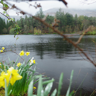 Nous commençons d'ailleurs par la fameuse randonnée du Coire Gabhail, encore appelée "The Lost Valley", qui porte parfaitement son nom. Il faut jouer d'astuces et compter un peu sur la chance pour tenter de passer entre les gouttes, et le pari est réussi pour cette superbe promenade . Les paysages au départ sont intimidants, on se sent minuscules au sein de cette nature si brute, éclairée de temps en temps de traversées solaires divines. Un peu plus de quatre kilomètres en tout, 350 mètres de dénivelé, rien d'insurmontable, et par chance, un temps qui reste donc relativement sec toute la matinée pour nous permettre de profiter pleinement des paysages qui nous offrent tous les dégradés d'or et d'oranges au sortir de l'hiver. Nous évoluons dans une des failles des "Three Sisters", en une grimpette continue avec un peu d'escalade le long d'un torrent abondant, pour aboutir à un cirque final. Même sans le soleil, les couleurs sont incroyables, et l'ambiance surtout est tellement dramatique, dans son sens le plus noble bien sûr! Pour le retour, on trouve un autre chemin plus en hauteur, qui nous permet un retour plus facile et une vue dégagée sur le panorama grandiose. Après trois heures de marche en famille et avec trois générations réunies, le sentiment de fierté et de satisfaction est au rendez-vous, les enfants ont adoré cette rando, qui les a impressionnés dès les premiers pas. Mais voilà que les estomacs crient famine et on se refugie, alors que la pluie s'invite, dans un petit café "tearoom" où les sandwichs et la soupe du jour nous offrent une belle récompense. Les scones à la crème et à la confiture de framboises viennent parfaire le tout! La pluie ne cesse pas, elle faiblit, s'interrompt quelques minutes puis repart de plus belle, c'est impressionnant mais complètement banal pour le pays, il va falloir s'y habituer! La sieste à l'auberge est donc la bienvenue et on profite d'une petite accalmie en fin de journée pour aller se balader entre adultes autour d'un petit loch à proximité, dans un paysage boisé beaucoup plus sage.