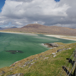 Harris et Lewis c'est un paysage aussi aride que les Highlands à l'intérieur des terres, avec sa lande, sa tourbe, ses roches, son gneiss, ses loch. Harris et Lewis, ce sont surtout des côtes maritimes d'une douceur absolue, faites d'immenses baies de sable, de dunes à perte de vue, de dizaines de nuances de turquoises dès que le soleil brille, qui vire au pastel ou au gris profond quand le ciel s'assombrit.