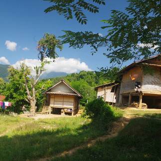 Le premier village visité héberge trente cinq familles qui représentent deux cents personnes, mais ce matin, la plupart des adultes sont partis aux champs, on est en plein dans la saison de la récolte du riz. Restent les grands-parents, qui gardent les jeunes enfants, tandis que les plus grands sont à l'école.