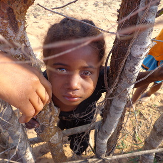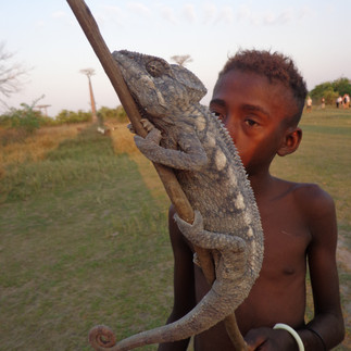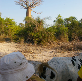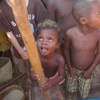 Excellents souvenirs de cette vie en immersion dans la vie quotidienne africaine (puiser l’eau, éclairage à la bougie, douche au seau et à la tasse, Félix était effrayé par « le trou » créé dans le sol de « notre salle de bain », initiation à la pêche au crabe en pirogue (très précaire la pirogue à balancier !!), recherche de lémuriens dans les baobabs, et bien sûr splendide coucher de soleil à l’allée des Baobabs !!) : nous avons aussi fait la connaissance des villageois (les enfants nous inspectaient au loin accroupis, morts de rire, puis se sont enfuis en courant effrayés quand nous nous sommes avancés Basile et moi !!! un vrai apprivoisement !!), les petits et les grands étaient ravis de se faire prendre en photo pour que je leur montre en instantané le résultat, nous avons vu la technique pour piler le riz, et tous étaient (tu parles !!) ravis des petits cadeaux que j’avais ramenés (des bracelets, du maquillage, rouge à lèvres, échantillons de parfum que je n’utilisais pas), j’ai déclenché des disputes ! Un merveilleux souvenir que cette incursion à l'Ouest dans une Madagascar très africaine...