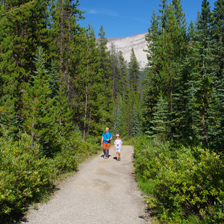Puis nous allons faire un petit tour dans Jasper, pour quelques derniers courses avant la fin du voyage : c’est un village étonnant, coincé le long de la Transcanadienne, la voie de chemin de fer qui traverse le pays d’Est en Ouest pour le transport de marchandises, avec ses wagons interminables et ses coups de locomotive qui explosent et résonnent dans toute la vallée à chaque passage. On y trouve quelques jolis bâtiments historiques, on y a surtout trouvé des pansements pour les ampoules de Basile et des vivres pour nos derniers pique-niques! Et de magnifiques wapitis dans l'eau de la rivière, tableau sublime sous nos yeux, qui prend des airs de conte pour enfants...
