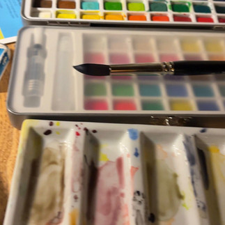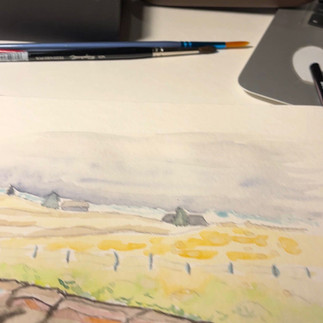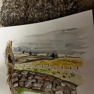 On lance un feu pour notre dernière soirée alors que le vent s’est posé: apéro, repas, jeux en famille, et je m’accorde un temps d’aquarelle au coin du feu, de quoi laisser à notre hôte un petit souvenir…