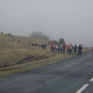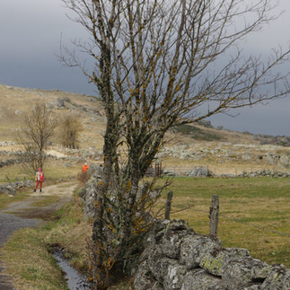 Sur la route du retour, les plateaux d'altitude défilent à nouveau, on retrouve la brume et de ci-de là des étendues neigeuses sur les hauteurs. Aujourd'hui se tient un événement majeur en Aubrac, "les Traces" : c'est une randonnée à travers les prairies, de buron en buron, qui accueillent les marcheurs pour déguster de l'aligot, des fromages d'Aubrac, de la fouasse, du vin chaud et de la liqueur de gentiane, la plante-star du coin! On croise ainsi de nombreux marcheurs dans cette météo capricieuse, mais tous ont le sourire et le courage de l'effort, car ils savent ce qui les attend à chaque étape!