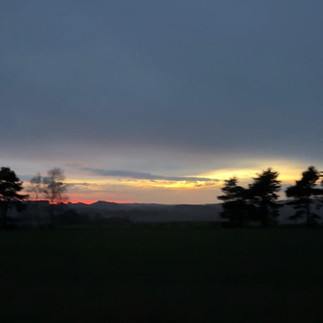 Le retour au buron se fait à la nuit tombée, une jolie lumière de coucher de soleil apparaît à l’horizon derrière les sapins.