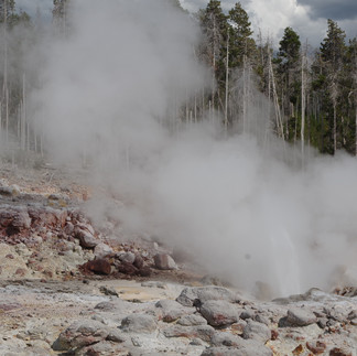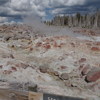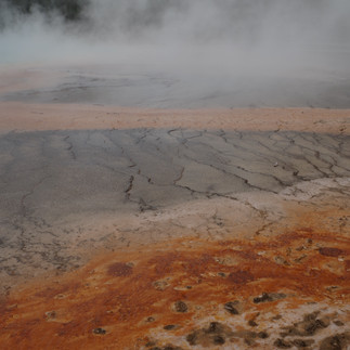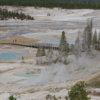 Puis Norris Geyser Basin s'est dévoilé à nous sur l’après-midi de notre retour : un site immense ponctué de turquoises, de bleus laiteux et de rouille, une vue lunaire à 180 degrés! Le vent est fort, gare aux pertes de casquettes, ici pas question de les récupérer !