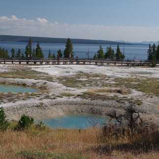 Notre première approche de cette activité intense s’est faite par West Thumb Basin qu'on a visité lors de notre descente vers Grand Teton la semaine précédente : deux salles deux ambiances en une demi-heure de promenade ! Un ciel lourd d’abord, avec les mystères des vapeurs dans le gris de l’horizon, puis un grand soleil venu sublimer les bleus des sources… Nous avons énormément apprécié la balade très poétique sur ce site qui donne sur le lac de Yellowstone, avec peu de monde dans ce début de matinée.