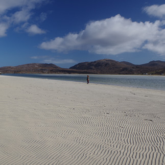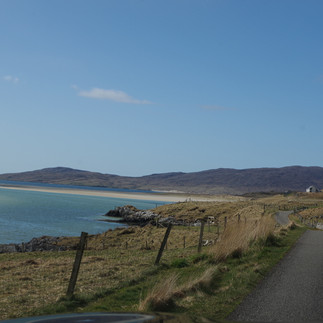 Une heure quarante de traversée sur une mer d’huile, que rêver de plus ? On en profite pour se faire une petite sieste sur les canapés, puis on sort sur le pont pour voir se dessiner l’approche de ces nouvelles terres. Il est 16h quand nous accostons, on prend alors directement la route pour la baie de Luskentyre, réputée une des plus belles de tout le Royaume-Uni! Puisque le ciel est bleu, on veut en profiter tout de suite. On a appris un adage en Ecosse : si tu vois arriver le soleil, prends le dès qu'il se présente, tu ne sais pas si il sera là demain (ni même dans quelques minutes d’ailleurs!).