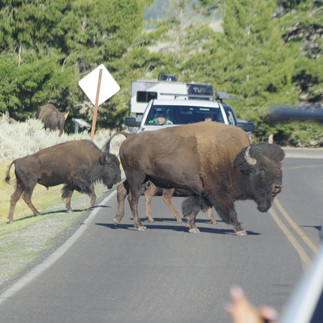 Cette partie du parc, faites de grandes plaines, est le royaume des bisons. Les paysages sont sublimes dans la lumière qui descend, on rencontre effectivement nos premiers bisons, qui marquent le début d’une très longue file d’attente!